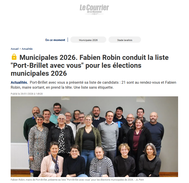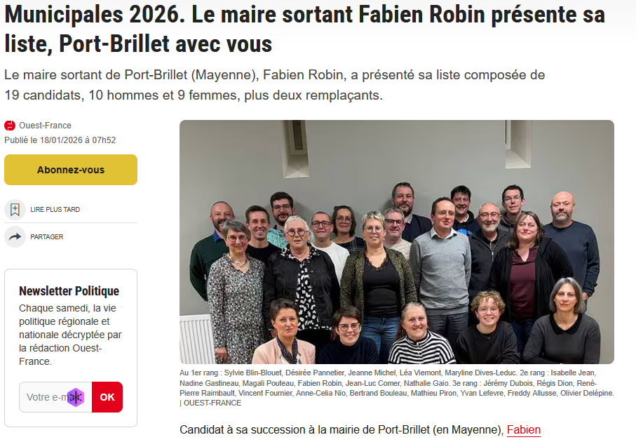 Le journal Ouest-France parle de Port-Brillet avec vous Nous remercions chaleureusement le journal Ouest-France pour son article consacré à la présentation de la liste menée