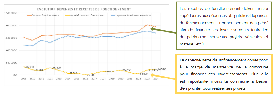 • les capacités d’autofinancement se sont améliorées au cours du mandat. Une rigueur dans la gestion financière courante et une hausse modérée mais nécessaire des impôts locaux ont permis de dégager un excédent financier satisfaisant ces trois dernières années. L’autofinancement des projets a presque doublé sur ce mandat, passant de 580 000 € sur la période 2014/2019 à 1 000 000 € sur la période 2020/2025.